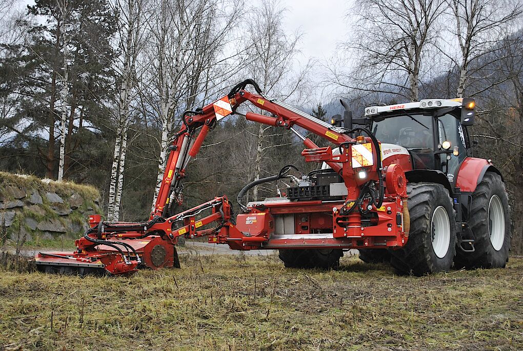 Randstreifenmulcharbeiten mittels Auslegemäher und Reinugsgebläse.